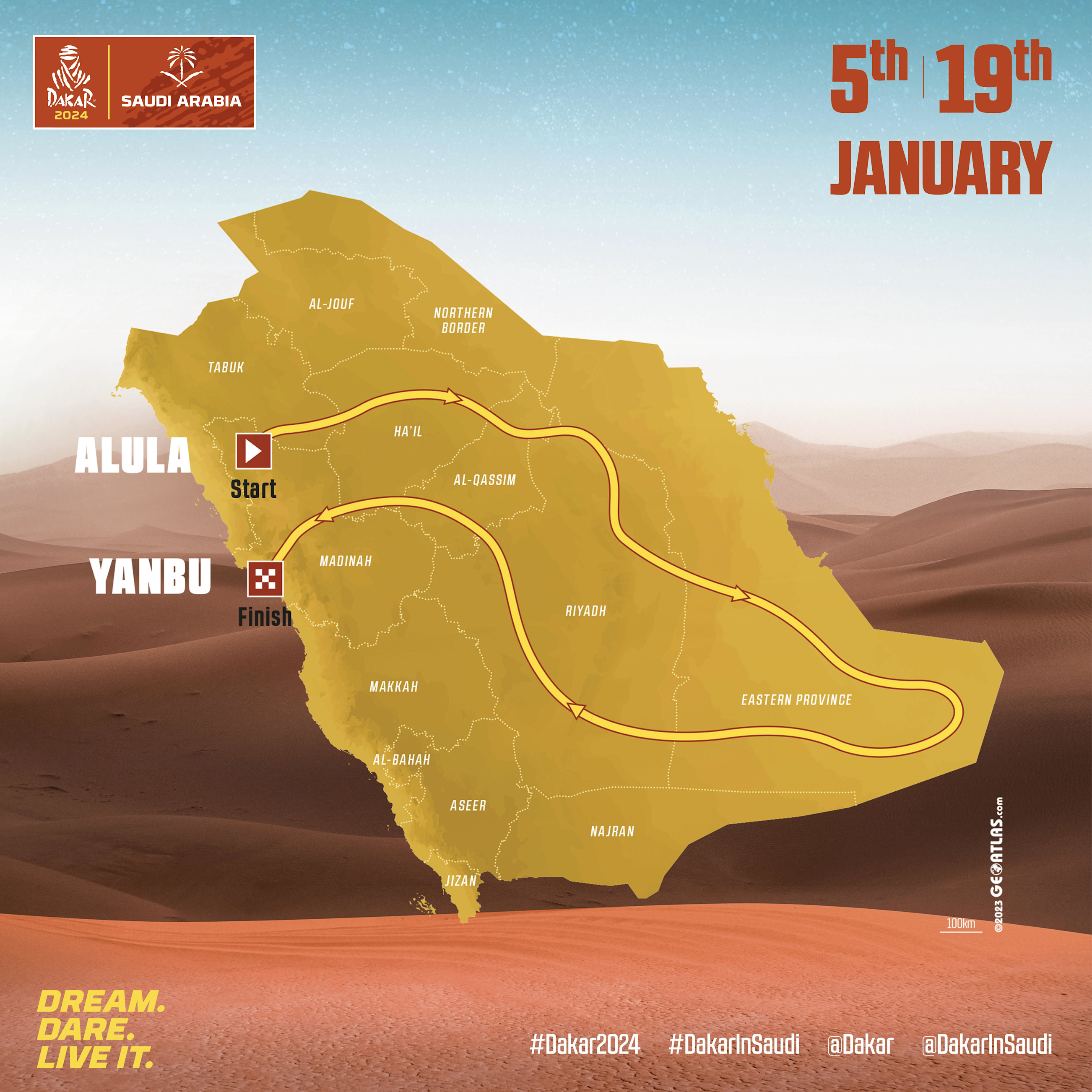 - The rally's fifth edition in Saudi Arabia will be held from 5 to 19 January 2024, starting in the thousand-year-old city of AlUla, crossing the country in the direction of the Empty Quarter and finishing in Yanbu on the shores of the Red Sea.